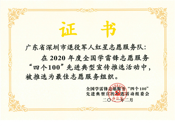3月31日,中宣部、中央文明辦召開推進學雷鋒志願服務工作電視電話會議,表彰2020年度全國學雷鋒志願服務「四個100」先進典型。深圳市退役軍人紅星志願服務榮獲全國學雷鋒志願服務「四個100」「最佳志願服務隊組織」。