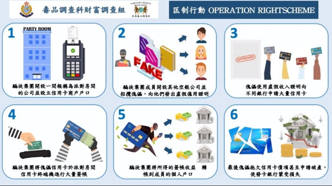 毒品調查科財富調查組總督察張恒暉今日(2日)表示,該詐騙集團成立一間假派對房間公司,並借公司設立信用卡戶口,又成立多間空殼公司,藉此招攬不少人手,並為他们提供虛假僱員紀錄及入息證明,協助申請逾200張涉及不同公司的信用卡。再利用信用卡戶口進行大量簽賬,在2019年1月至2020年7月期間,簽賬涉款逾8500萬元。平均簽賬金額達4萬多元,最高簽賬金額更達12萬元。