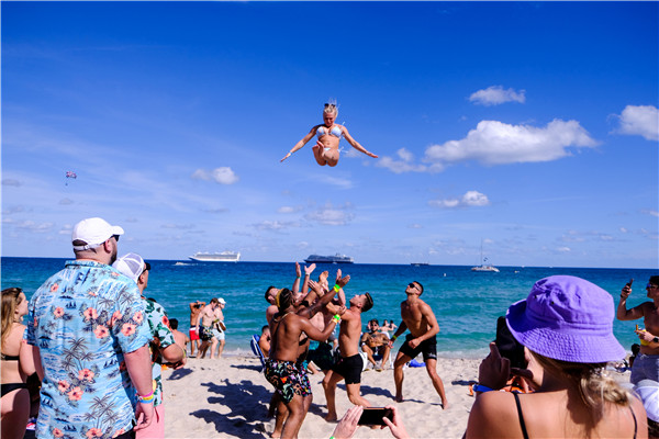 在美國佛羅里達州勞德代爾堡,一名大學女運動員被一群男子拋向空中慶祝春假。
