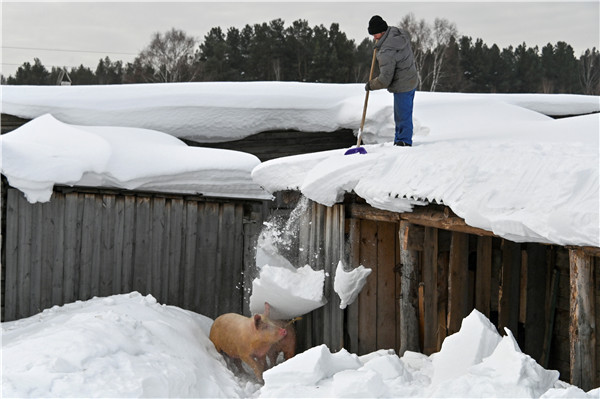 俄羅斯鄂木斯克地區波布羅夫卡村,一位居民站在木屋頂上清理積雪,積雪落在豬身上一瞬。