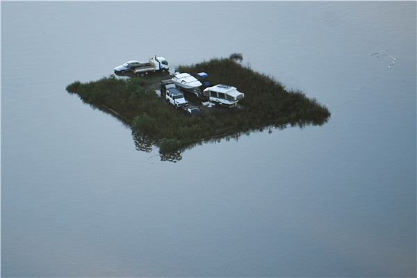 在澳洲悉尼附近的溫莎地區,從一架直升機上俯視該地區受洪水淹沒的情形。