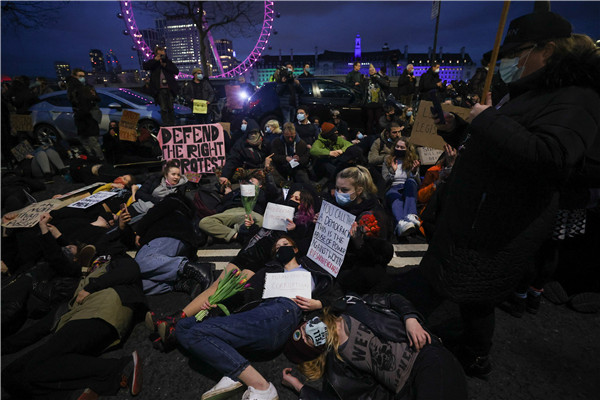 英國倫敦,莎拉•埃弗拉德被綁架並被謀殺後,示威者在威斯敏斯特大橋上靜坐抗議。