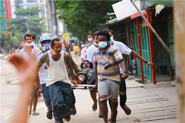 在緬甸仰光的Thingangyun,一名男子在鎮壓反政變抗議者時被槍擊,他在擔架上以三指致敬。