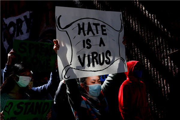 一名槍手在佐治亞州亞特蘭大槍殺8人,其中包括3名亞裔女性,人們在「阻止亞裔仇恨」集會上舉着「仇恨就是病毒」的標語。