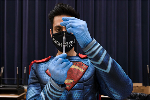在美國賓夕法尼亞州一家診所,人稱麥博士的阿明醫生穿上舊超人萬聖節服裝接種疫苗。