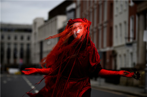 愛爾蘭都柏林,一名紅色反抗軍成員在政府大樓外抗議釋放天然氣的「水力壓裂」過程對環境產生危害。