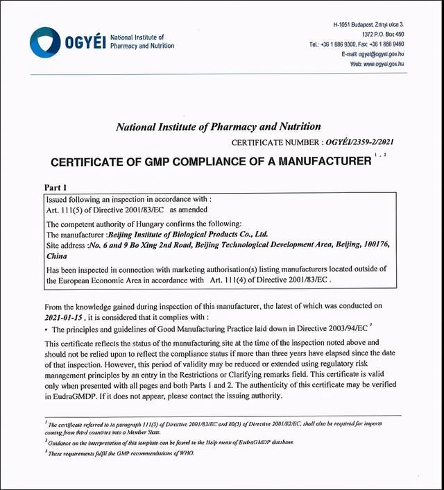 國藥中國生物介紹,1月13至15日,匈牙利國立藥學與營養研究所對其北京生物製品研究所進行了相關的GMP審計。經過嚴格審計和綜合判定,前者認為,後者生產的新冠滅活疫苗符合歐盟標準,並允許應急使用。3月3日,國藥中國生物北京生物製品研究所向匈牙利藥監部門提交了相關後續報告。4月1日,按照歐盟監管標準和規則,匈牙利國家藥品審批監管機構正式向國藥中國生物北京生物製品研究所頒發新冠滅活疫苗歐盟通用GMP證書。