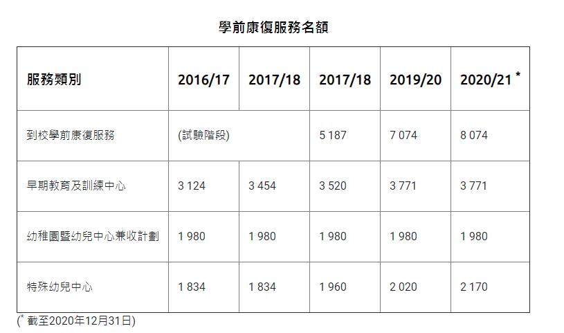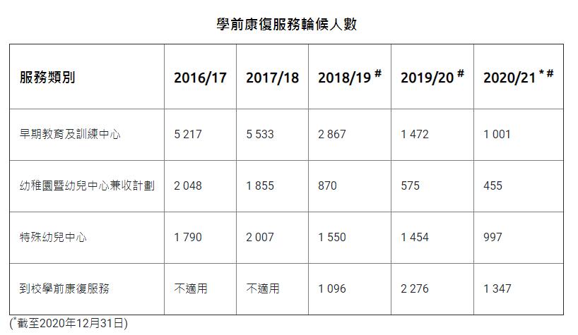 羅致光又表示,由於到校學前康復服務的恆常化與名額大幅度增加,平均的輪候時間大幅縮短,5年間,早期教育及訓練中心的輪候時間由17.9個月減至11.2個月。他預期,在未來2至3年,到校學前康復服務與早期教育及訓練中心的輪候時間將會接近零,勞福局及社會福利署會檢視仍在規劃發展中的部分早期教育及訓練中心,可否轉化成特殊幼兒中心。