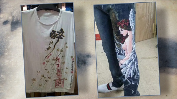 (右)寫上中文字的T恤,吸引深圳廠家要求合作。(左)手繪牛仔褲天使作品,當年售價約二千多元。