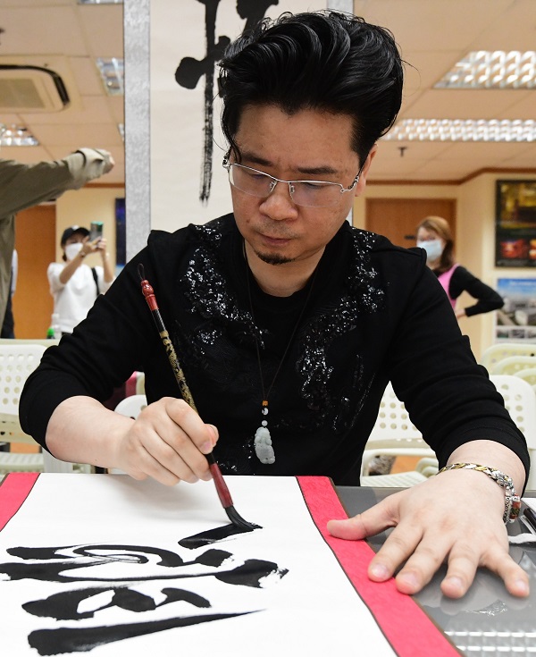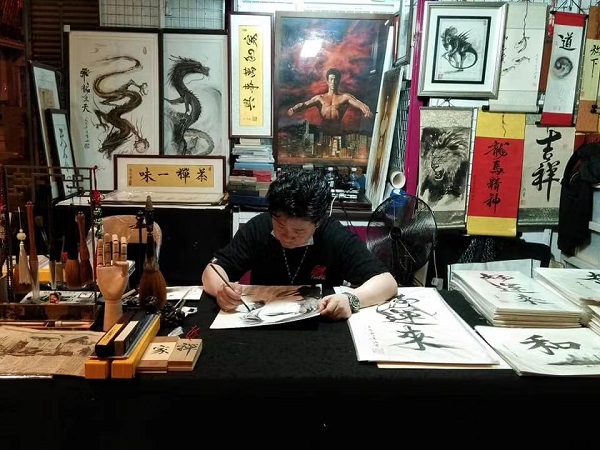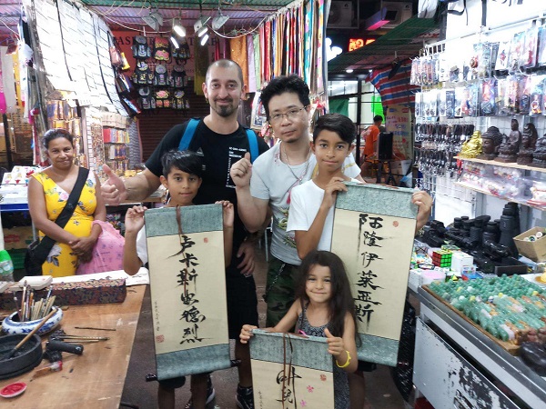 外國遊客要求陳笑洛為三位子女的名字,寫成中文書法。
