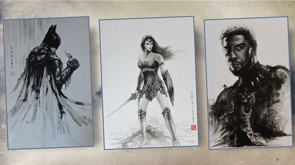 陳笑洛水墨畫風超級英雄作品:(左起)蝙蝠俠、神奇女俠、黑豹。