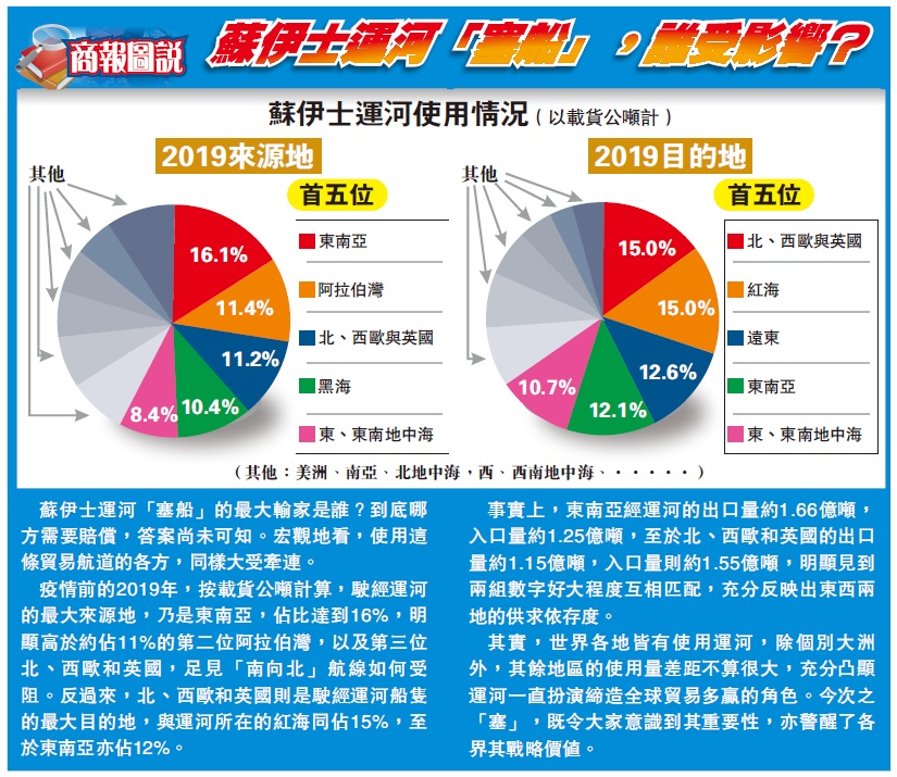 疫情前的2019年,按載貨公噸計算,駛經運河的最大來源地,乃是東南亞,佔比達到16%,明顯高於約佔11%的第二位阿拉伯灣,以及第三位北、西歐和英國,足見「南向北」航線如何受阻。反過來,北、西歐和英國則是駛經運河船隻的最大目的地,與運河所在的紅海同佔15%,至於東南亞亦佔12%。