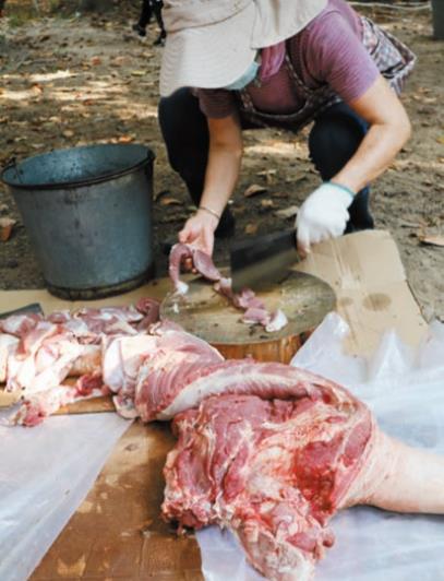豬肉是「食山頭」的靈魂,據祭主鄧生說,今次祭祖花費5萬多元,其中豬肉支出愈來愈多,與去年相比,生豬肉已由每斤73元升至75元。鄧聯興說,「食山頭」豬肉分量多年前由百多斤加至二百斤,近五六年再調升至350斤。他指,今次盆多豬肉分量自然少,但他相信足夠4至6人飽腹,大快朵頤。(記者 鄭玉君)