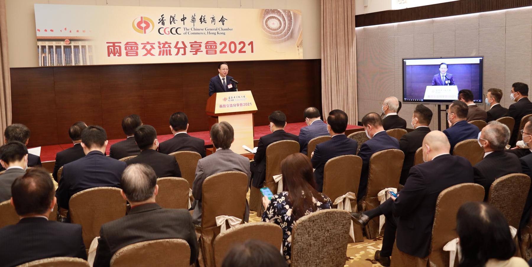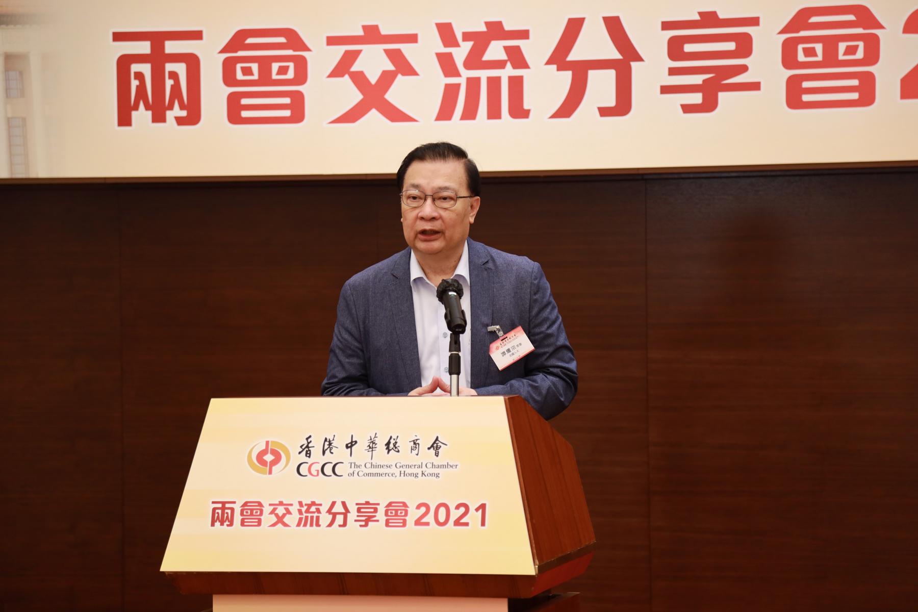 香港中華總商會7日舉辦「2021年全國人大政協交流分享會」。中聯辦副主任譚鐵牛應邀擔任主旨演講嘉賓,分享今年兩會重要精神與政策方向。中總會長袁武代表該會致歡迎辭。全國人大常委譚耀宗,全國政協常委、中總永遠名譽會長蔡冠深擔任專題演講嘉賓,暢談會議對香港帶來的啟示,以及對完善香港選舉制度的意見。