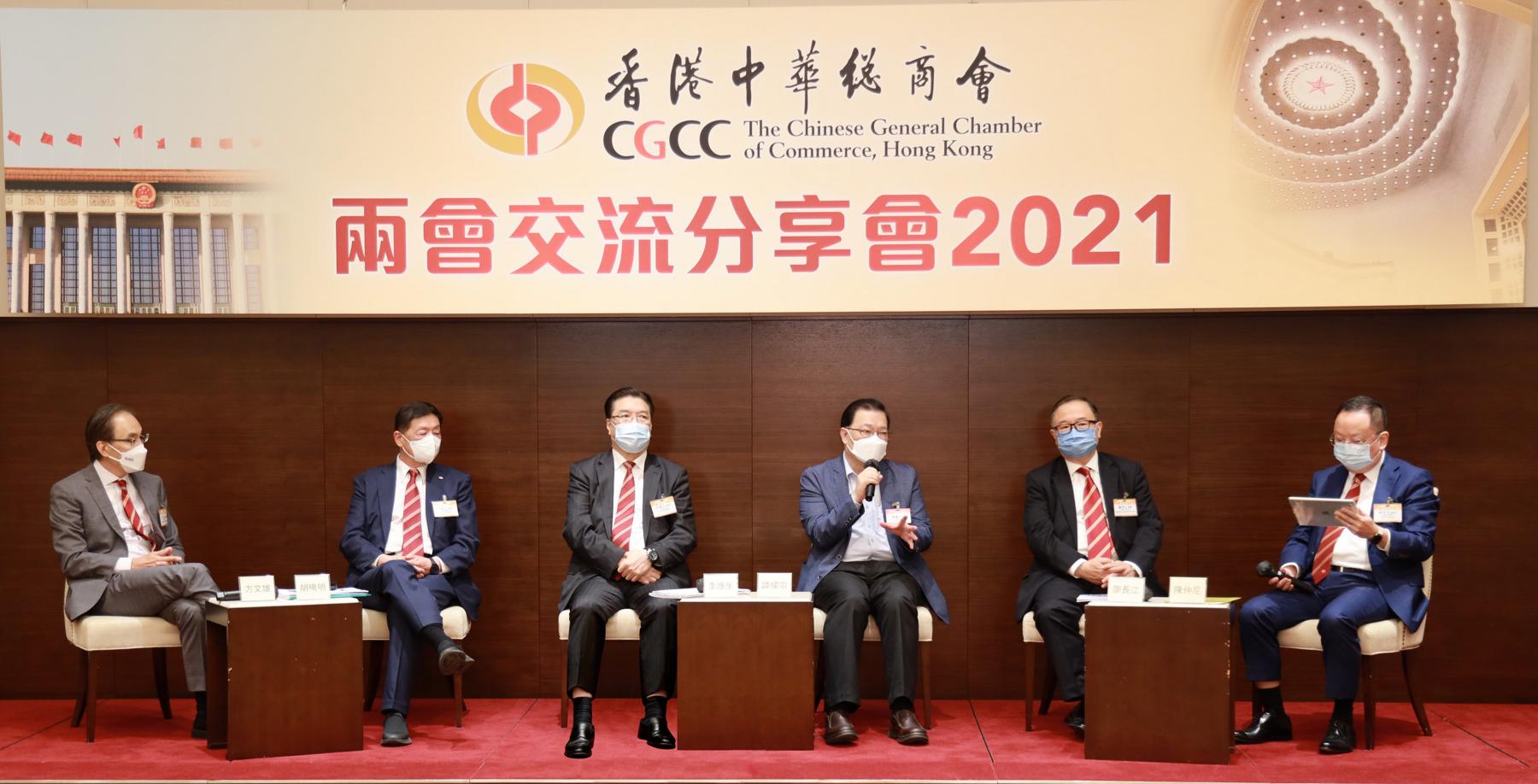 分享會設對談環節,港區人大代表、中總李應生、胡曉明副會長,廖長江常董,以及全國政協委員曾智明、王惠貞、陳仲尼、張學修副會長,方文雄榮譽會長,聯同譚耀宗交流感受。嘉賓對今年兩會均有深刻體會,特別是積極推動現代化、高質量發展,致力改善社會民生,對國家未來發展前景充滿信心。李應生強調,國家無論在防疫、精準扶貧、創科發展、關顧香港等各方面工作,均達到非常高的水平。