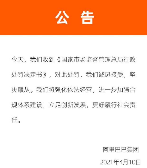 4月10日上午,阿里巴巴發布公告稱,今天,我們收到《國家市場監督管理總局行政處罰決定書》,對此處罰,我們誠懇接受,堅決服從。我們將強化依法經營,進一步加強合規體系建設,立足創新發展,更好履行社會責任。