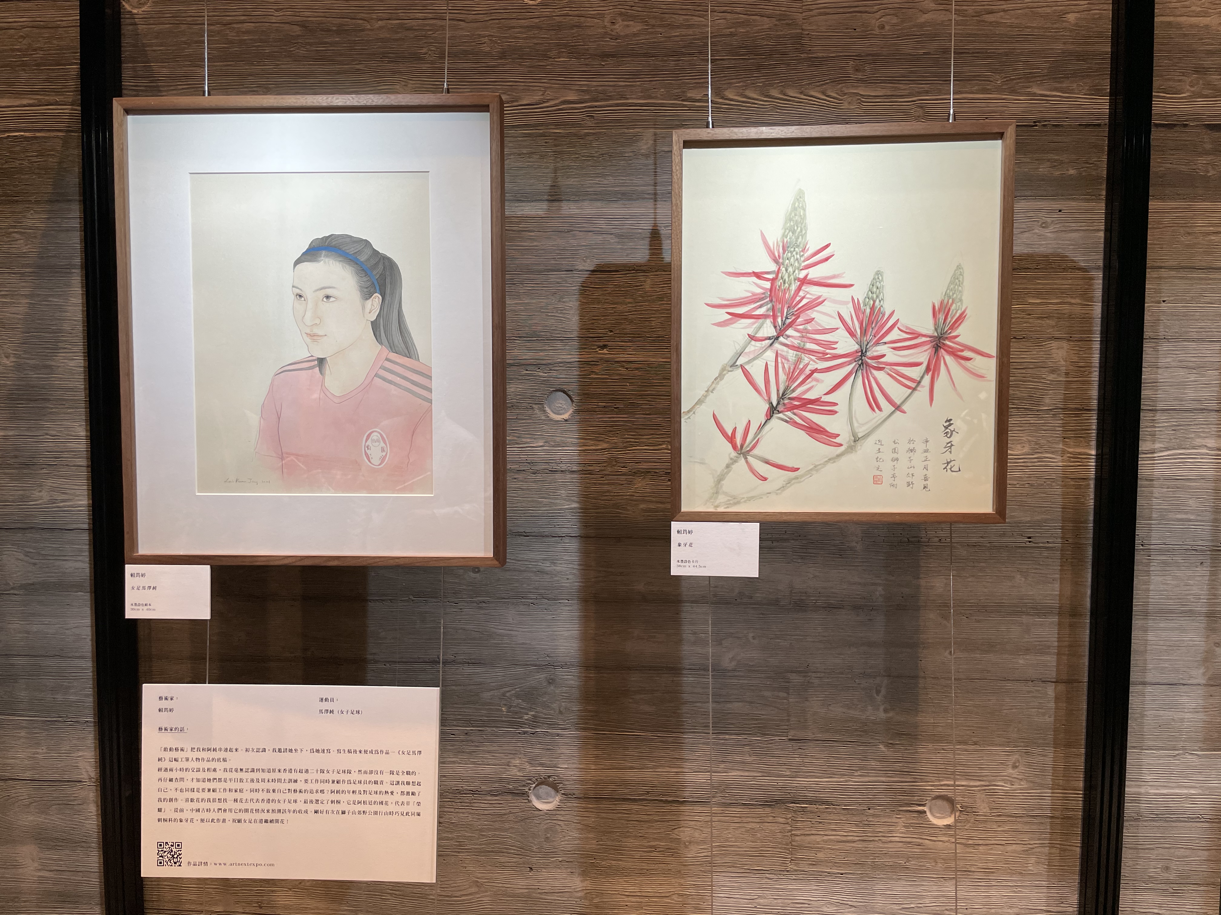 水墨設色絹本作品《女足馬澤純》(左)及象牙花(右)。