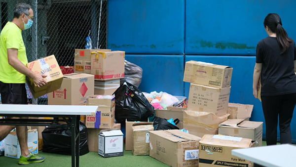簡仲文(左)做善事親力親為,落手落腳幫忙整理物資。
