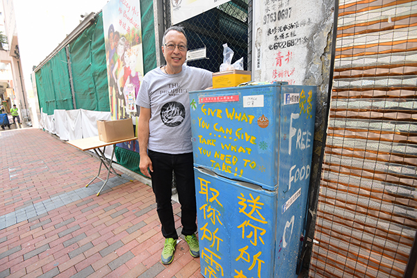 善行體育基金創辦人簡仲文(Ahmed Khan)在佐敦設立藍雪櫃讓生活拮据的人隨時打開雪櫃拿取免费乾糧。