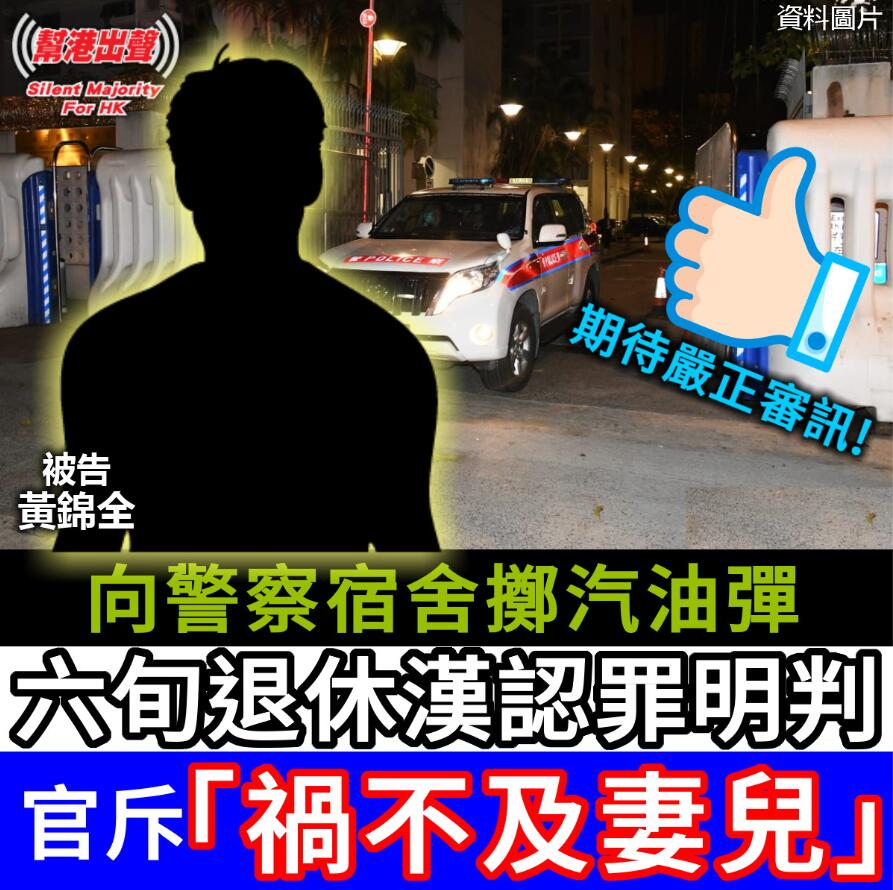 一名63歲男子,被控於去年3月23日淩晨,先用鐵線綑綁上水已婚警察宿舍閘門後,再投擲3枚汽油彈,導致一輛私家車被毀壞。他其後被警方截獲,並被搜出通渠水及一把闊刃鋤頭。他昨日(12日)在區域法院承認有意圖而縱火、管有腐蝕性物品及適合作非法用途的工具3罪,法官押後至今天(13日)判刑。法官指本案存在嚴重人命傷亡及財產損失的潛在風險,被告的行為亦是對法治的直接衝擊,將被告判囚42個月,並下令被告賠償5000港元。法官更在判詞引用歌詞,規勸其他人勿以身試法。