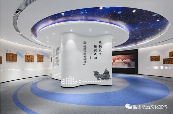 「法之魂」展區以器物浮雕、法治文化故事的形式直觀展示法的精髓、特徵以及價值,另設有憲法書造型,介紹憲法的基本原則及主要內容。「法之窗」展區通過聲、光、電等科技手段,全方位、多層次、立體化展示我國法治建設成就,由三維立體虛擬解說人物「鹽田小法」重點講述改革開放以來深圳市及鹽田區的法治成果,普及法律知識。「法之鏡」展區運用傳統和現代手段有機結合方式,以反邪教知識問答、H5互動有聲漫畫的形式展示普及邪教的特徵及危害,引導參觀者識別、防範和抵制邪教。「法之悟」展區以AR互動式沉浸體驗技術及互動遊戲的形式講述法治故事、反邪教故事,傳播法律知識,讓參觀者身臨其境地感受法治文化的熏陶和增強自覺抵制邪教的意識。「法之光」是一個多功能展區,用於舉辦法治、反邪教知識講座及業務討論會,播放宣傳片等。