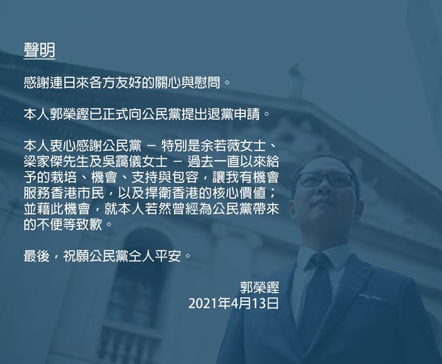 立法會法律界前議員郭榮鏗早先被傳已離開香港前往加拿大。今天傍晚,他在社交網站發表聲明稱,自己已正式向公民黨提出退黨申請。他又在聲明中感謝公民黨及三位成員余若薇、梁家傑及吳靄儀過去一直以來給予的栽培。他還表示,就其若然曾經為公民黨帶來的不便等致歉。