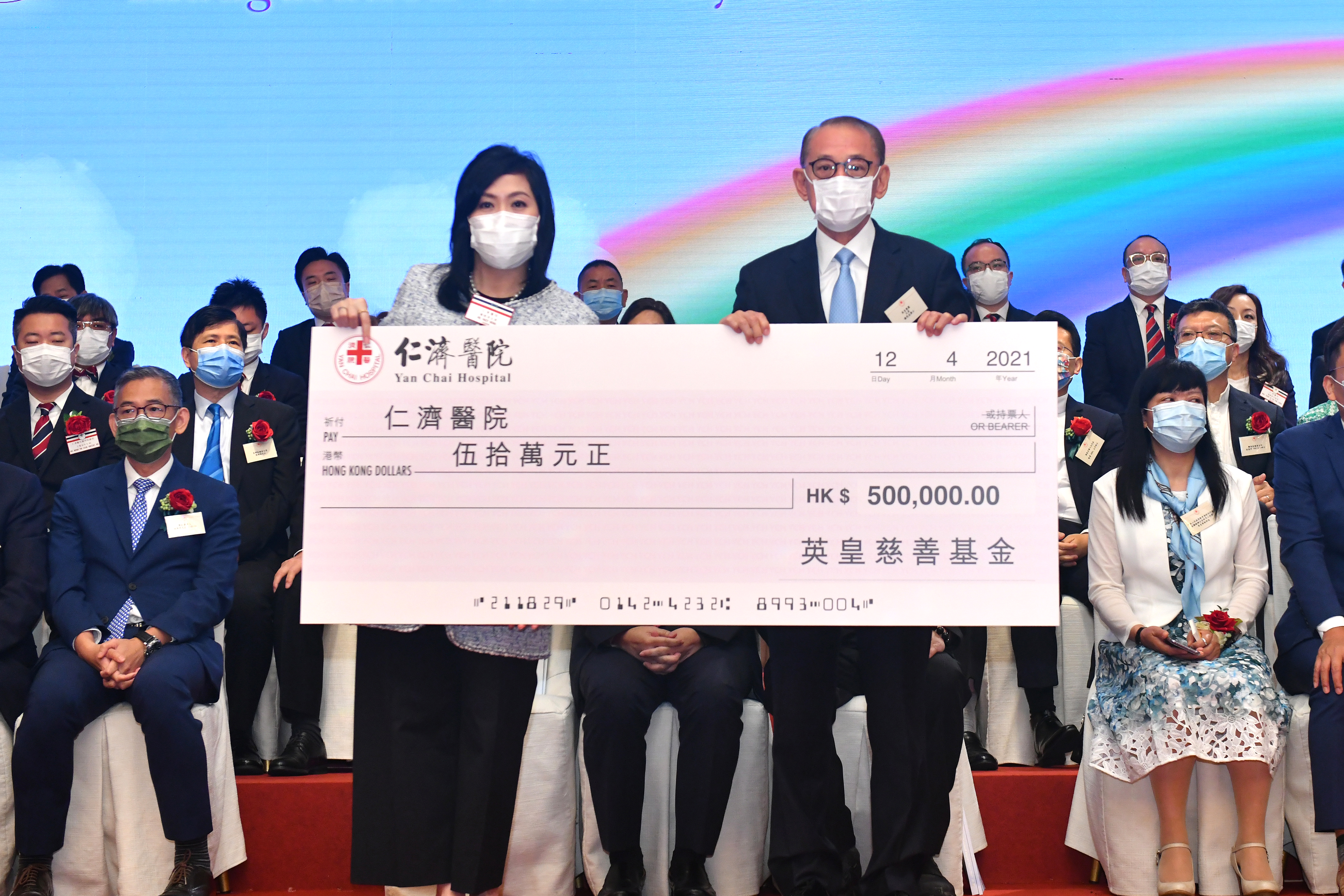 第54屆仁濟醫院董事局主席黃楚淇代表醫院接受李運強及英皇慈善基金的支票捐贈。