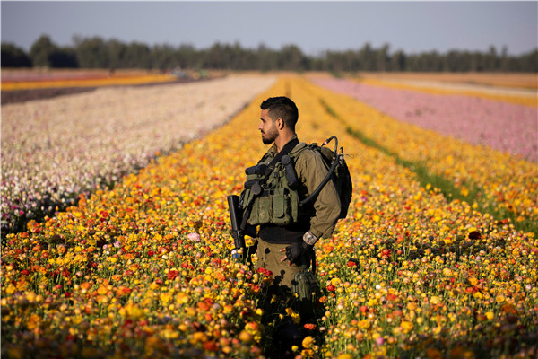 2021年4月12日,加沙地帶外,以色列南部Nir Yitzhak基布茲農場附近,一名以色列士兵走在一片毛茛花叢中。