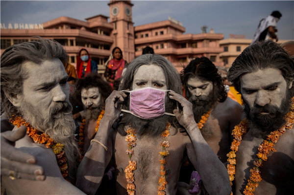 在印度Haridwar的大壺節上,一名納迦苦行僧戴著口罩參加在恆河中游泳的遊行隊伍。