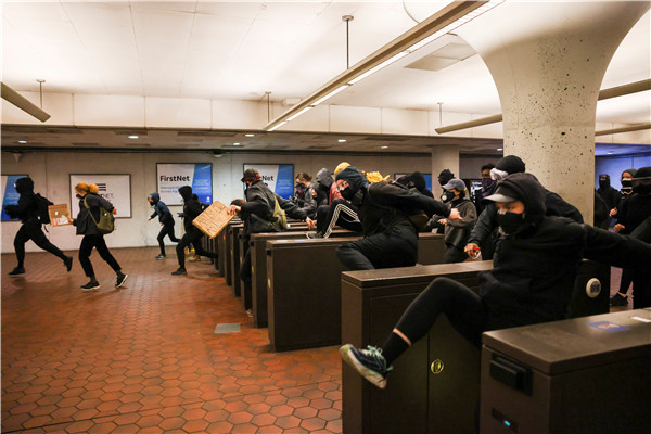 在華盛頓明尼蘇達州,20歲的黑人丹特•莱特被警察開槍打死後,抗議者從美術館廣場地鐵站的閘口跳過。