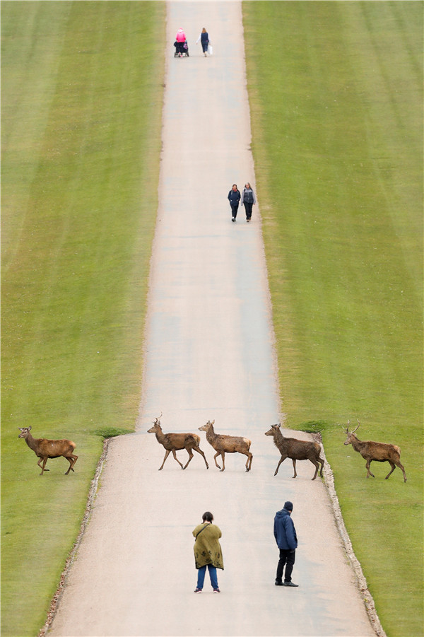在英國倫敦附近的溫莎,一群鹿穿過長長的步道。