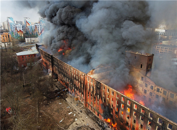 俄羅斯聖彼得堡中部的涅瓦卡婭製造工廠發生火災,大火引起陣陣濃煙。
