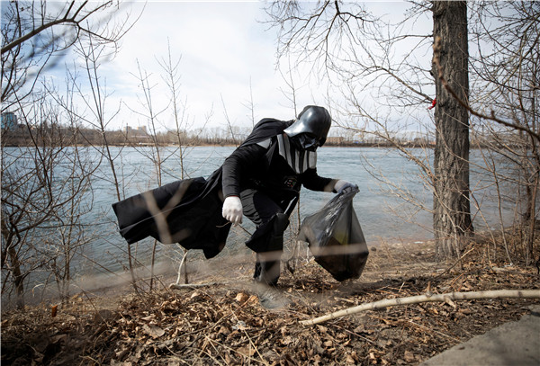 在俄羅斯伊爾庫茨克舉行的紀念第一次載人航天飛行60周年活動上,一名志願者裝扮成《星球大戰》中的達斯•維達在撿垃圾。