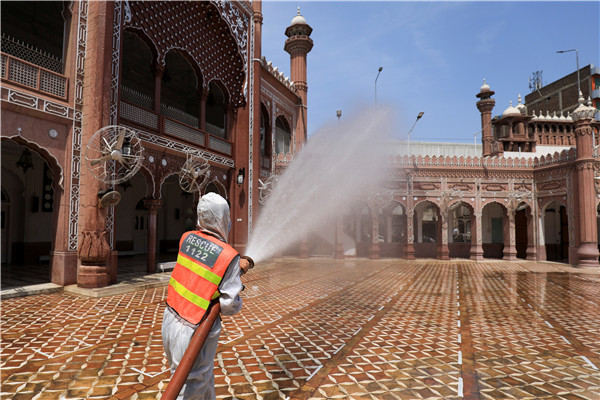 巴基斯坦白沙瓦,一名工作人員在齋月前為一座清真寺噴灑消毒劑。