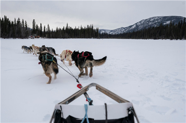 史蒂夫•羅賓斯(Steve Robbins)帶領他的雪橇犬隊在阿拉斯加伊格爾(Eagle)的一個疫苗接種點提供幫助後,穿過了結冰的湖泊。