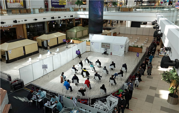 哈薩克斯坦努爾蘇丹的一家購物中心,人們等待接受Sputnik V(甘-冠狀病毒- vac)疫苗。