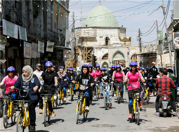 在伊拉克摩蘇爾,伊拉克婦女參加騎自行車活動。