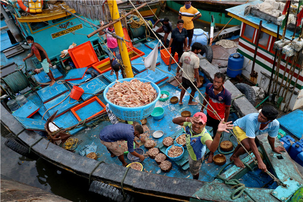 在新冠病毒蔓延之際,印度孟買,一名漁民將裝滿蝦的籃子扔進魚市進行分類。