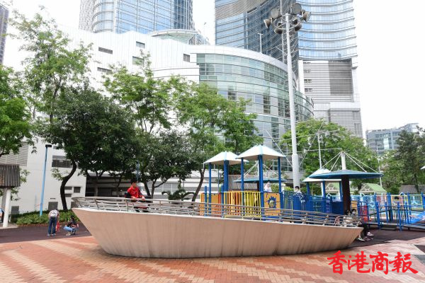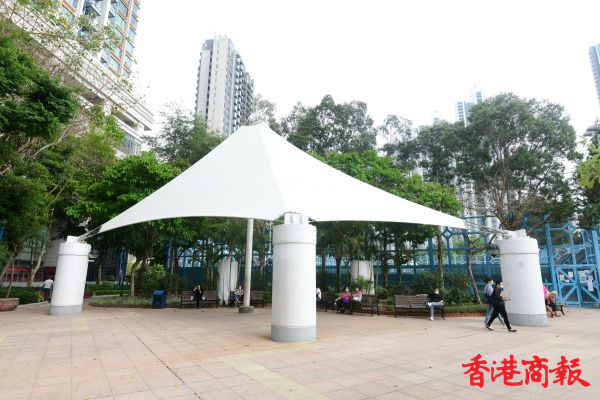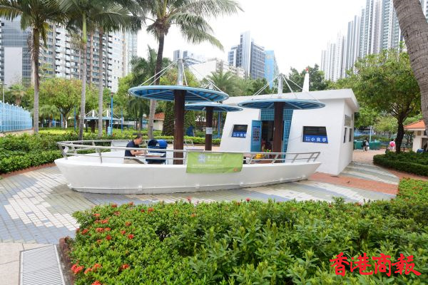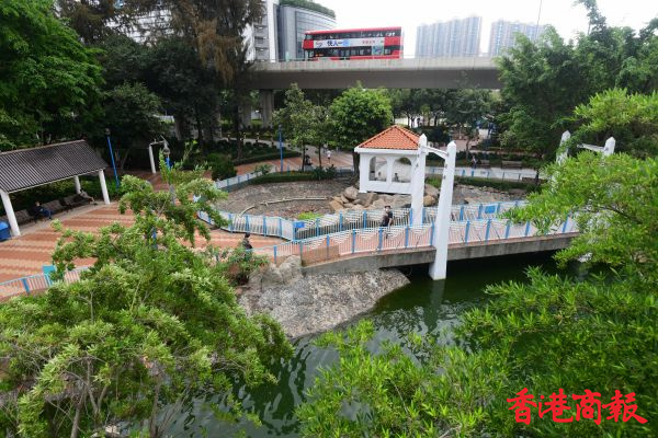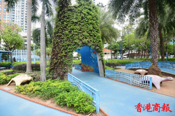 在荃灣公園有一座三層高的瞭望塔,可眺望整個公園外,最有「姆明之家」感覺正是瞭望塔門口,如卡通屋的粉藍色設計,感覺讓人如真的要進入姆明之家門口般;附近有一個露天劇場,背後建築如日本的尖頂教堂設計,隆重卻又帶點休閒格調。在前往人工瀑布的一條小橋上,只要駐足感受這個可愛的公園,彷如城市綠洲中也有一股清泉,令人回復童真。(崔俊良 攝)