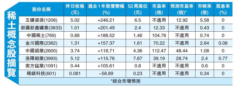 在多個舉措下,內地稀土政策或收緊,市場憧憬稀土概念股可望趁勢炒上。《管理條例》出台時,一眾A股稀土概念股造好,在港上市的稀土概念股於1月21日走高。其中,中國稀土(769)大漲68%。其他稀土概念股也全線向上,稀鎂科技(601)、五礦資源(1208)、新疆新鑫礦業(3833)、南方錳業(1091)、中國鋁業(2600)和洛陽鉬業(3993),當日分別升28.74%、13.1%、7.35%、6.82%、5.66%和2.28%。金川國際(2362)則無升跌。