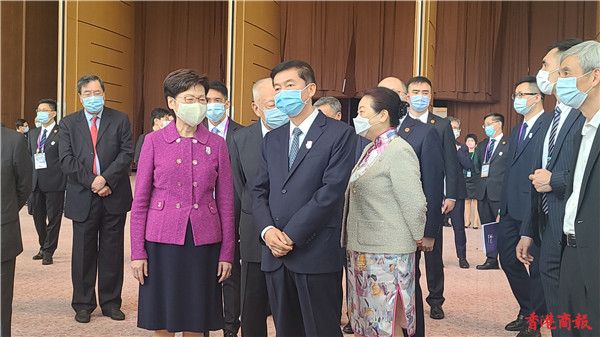 全國政協副主席董建華(左五),香港特區行政長官、香港特區維護國家安全委員會主席林鄭月娥(左六),中央人民政府駐香港特別行政區聯絡辦公室主任、香港特區維護國家安全委員會國家安全事務顧問駱惠寧(左四),中央人民政府駐香港特別行政區維護國家安全公署署長鄭雁雄(左三),中國外交部駐香港特別行政區特派員公署署理特派員楊義瑞(左二),中國人民解放軍駐香港部隊司令員陳道祥少將(左一)與特區政府三位司長、立法會主席和行政會議召集人合影。中新社