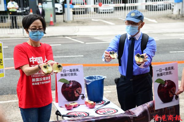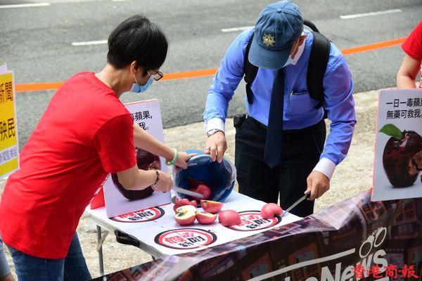 民間團體今日(15日)於律政中心舉行「成立監察組舉報毒果假新聞」集會,宣布成立「蘋果假新聞及毒新聞監察組」,並促請律政司盡快檢控《蘋果日報》今年2月涉嫌藐視法庭的內容,更即場發起「切毒果」行動。