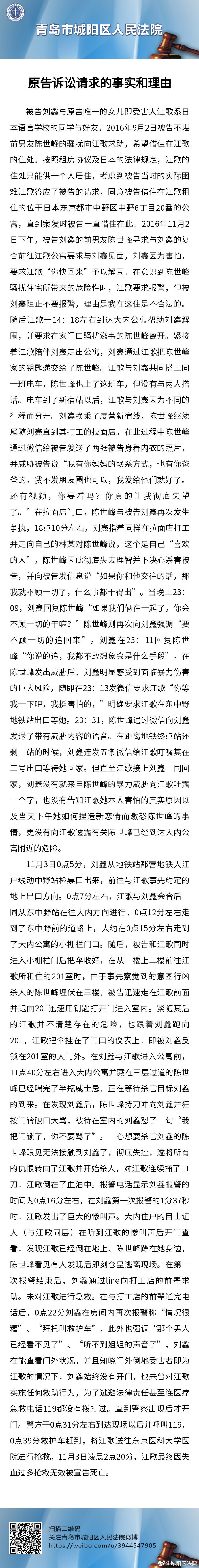 4月15日,江歌母親江秋蓮訴劉暖曦(原名劉鑫)生命權糾紛一案在山東省青島市城陽區人民法院開庭,原告及雙方委託的訴訟代理人出席庭審,劉暖曦本人未出席。