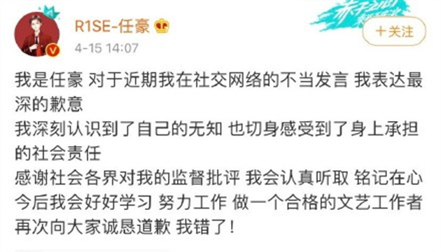 近日,R1SE男子組合成員任豪,就日本核廢水處理問題發表觀點,遭到全網群嘲。4月15日,任豪再次通過個人微博發文,他表示:對於近期自己在社交網絡的不當發言,表達最深的歉意,深刻認識到了自己的無知,也切身感受到了身上承擔的社會責任,感謝社會各界的監督批評,自己會認真聽取,銘記在心。
