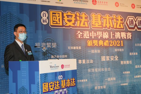為讓香港學界對「國家安全」議題有更深入的認識,香港善德基金會、青識教育發展中心聯合主辦,新界校長會、九龍地域校長聯會及香港島校長聯會協辦,推出首屆《國安法、基本法通通識》全港中學線上挑戰賽,開放予全港中學生參加。挑戰賽頒獎典禮今日(15日)舉行,教育局局長楊潤雄、中聯辦法律部劉春華部長及中聯辦新界工作部李薊貽部長擔任主禮嘉賓。