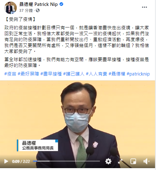 公務員事務局局長聶德權今日(15日)在FB發文表示,政府的疫苗接種計劃目標只有一個,就是讓香港盡快走出疫境,讓大家回到正常生活。他相信大家都受夠一波又一波的疫情起伏,如果沒有足夠的防疫屏障,當重新開放出行、重啟經濟活動,再度爆疫,是否又要關閉所有處所,又停頓幾個月,這樣不斷的輪迴?他相信大家都受夠了。