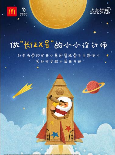 4月16日起,3-11歲的小朋友家長可以通過購買麥當勞開心樂園餐或為孩子報名「點亮夢想」麥當勞門店派對,獲得官方火箭卡進行創作,然後前往「微信小程序i麥當勞開心小會員」上傳作品 。通過審核的作品即可獲得中國探月蓋章授權電子證書,並被收錄至中國探月運載火箭創意設計庫。優秀火箭作品的小設計师還將有機會前往文昌發射場,現場觀看火箭發射。