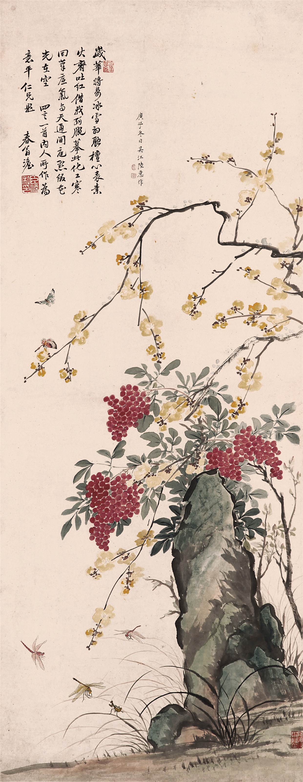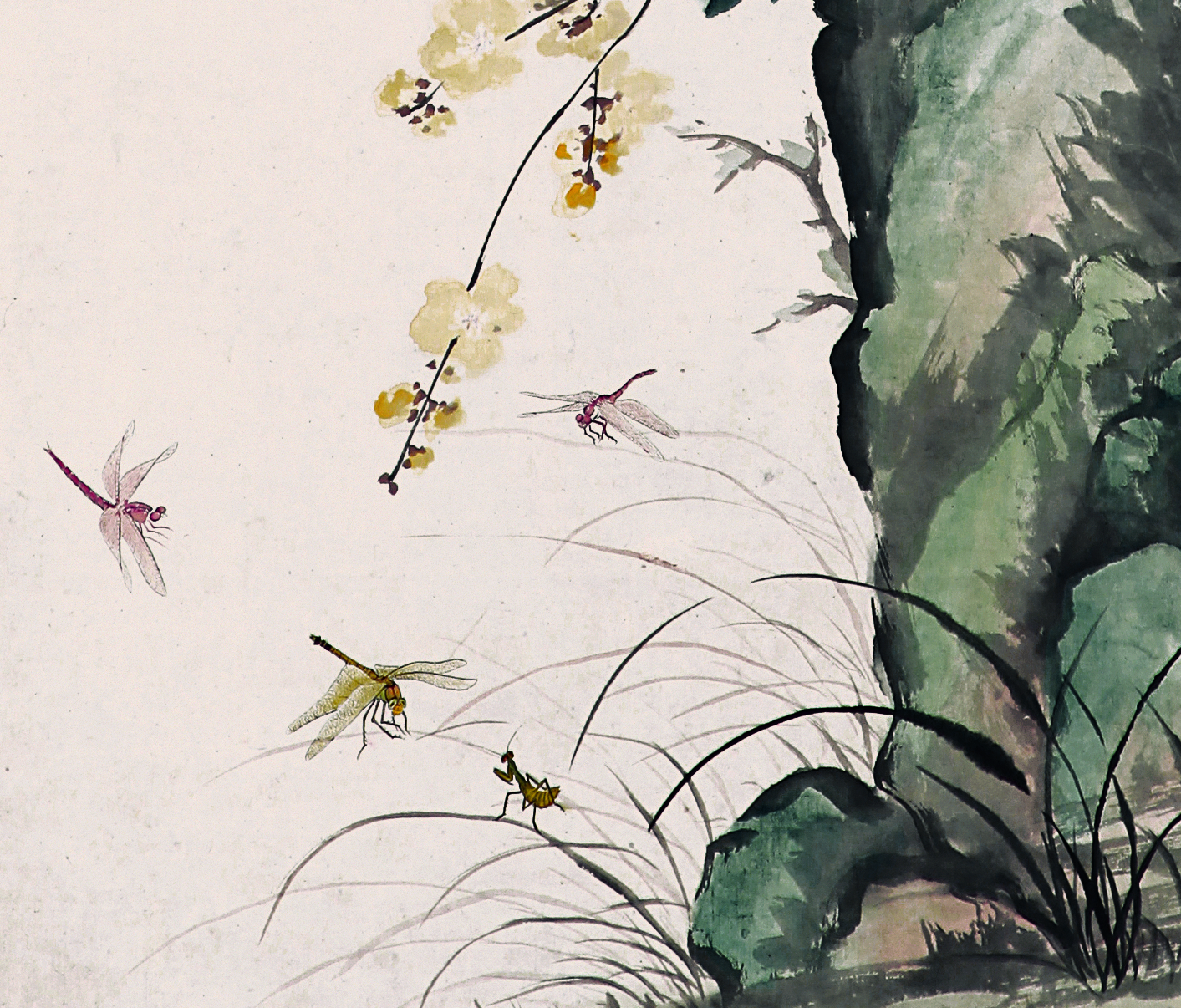 《天竹臘梅圖》乃陸惠作畫,張澹題跋,畫秀字雅,是這對神仙眷侶完美契合的最佳佐證。圖中一叢紅天竹與淡黃的臘梅交錯於奇石旁,色澤清麗,筆致工細,畫面左下方幾隻工筆繪成的蜻蜓飛舞於草葉間,情態各異,栩栩如生,與上端的蝴蝶遙相呼應,為畫面增添一抹生動的意趣。天竹是觀果佳品,因其能在冰天雪地中經久不凋,因此與水仙、臘梅並稱「歲寒三友」,寓意吉祥、好運、健康長壽。臘梅耐寒,淩寒獨自開,寓意獨立堅貞的高潔品質。天竹果枝與盛開的臘梅最為搭配,黃花紅果,色彩鮮麗,置於書院中,清香四溢,既適宜觀賞,又能靜心養氣,展現文人淩霜傲雪的風骨。