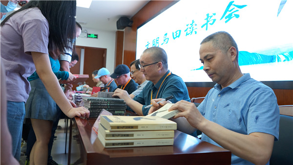 4月14日,第12屆「品鑒嶺南」中國著名作家採風團來到了深圳光明區馬田街道,本次活動由馬田街道辦與香港商報共同主辦。作家們參觀了光明國際汽車城以及位於鐘表基地的星皇鐘表集團。活動適逢國際讀書日即將到來,「文明馬田讀書會」因作家大咖們的到來,頓時增色不少。讀者報名一票難求,作家簽書一搶而空。作家們對馬田深有感觸,連俊義揮毫潑墨,寫下美好寄語:「光明大道、錦繡馬田」。