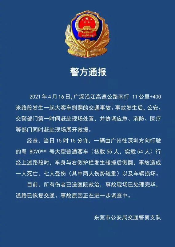 4月16日晚上21點50分,東莞市公安局交通警察支隊發布警情通報,2021年4月16日,廣深沿江高速公路南行11公里+400米路段發生一起大客車側翻的交通事故。事故發生後,公安、交警部門第一時間趕赴現場處置,並協調應急、消防、醫療等部門同時趕赴現場展開救援。